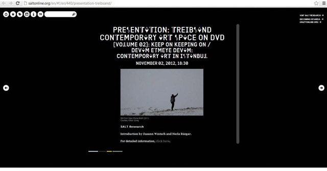 TREIBSAND is a unique Contemporary Art space on DVD being curated by Susann Wintsch*. Volume 02 of TREIBSAND focuses on contemporary art in Istanbul and will be published in October 2012. Entitled ‘ Devam Etmeye Devam' in Turkish and ‘ Keep On Keeping On' in English it contains works of 34 artists. It presents works by artists of different generations raising questions about the history of the future, justice and ways of co-existing. Having been posed at all times, these issues develop ever since, expressed by ideas and aesthetics of the contemporary. The works in Volume 02 comprise a wide range of approaches like political to poetic, conceptual to narrative. They have been selected in close collaboration with the artist Necla Rüzgar who lives and works in Ankara and Istanbul. Volume 02 of TREIBSAND will be launched in SALT Galata, Istanbul, in October 2012, and be available in museums, bookshops as well as for ordering online at www.treibsand.ch Joining artists :